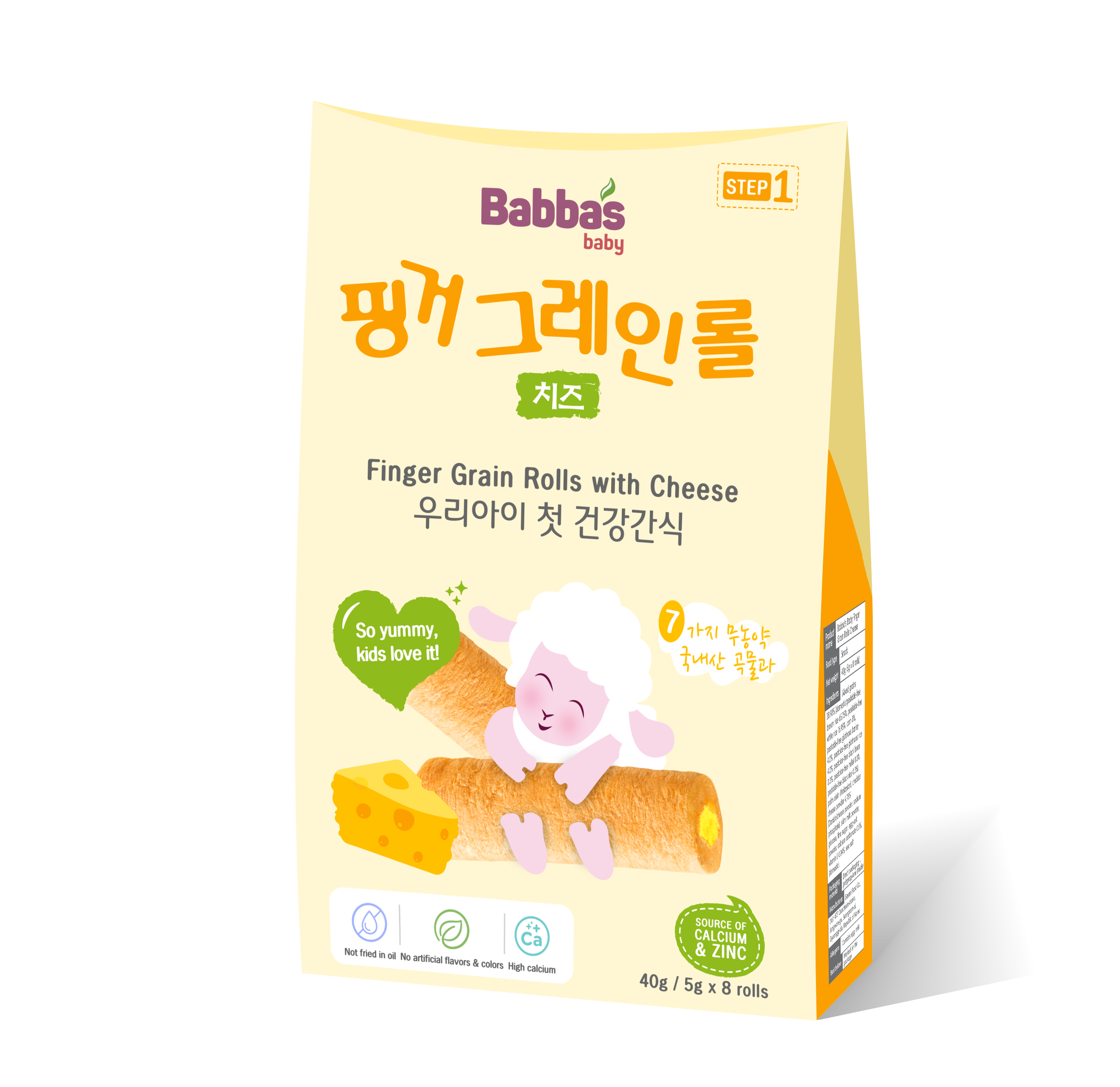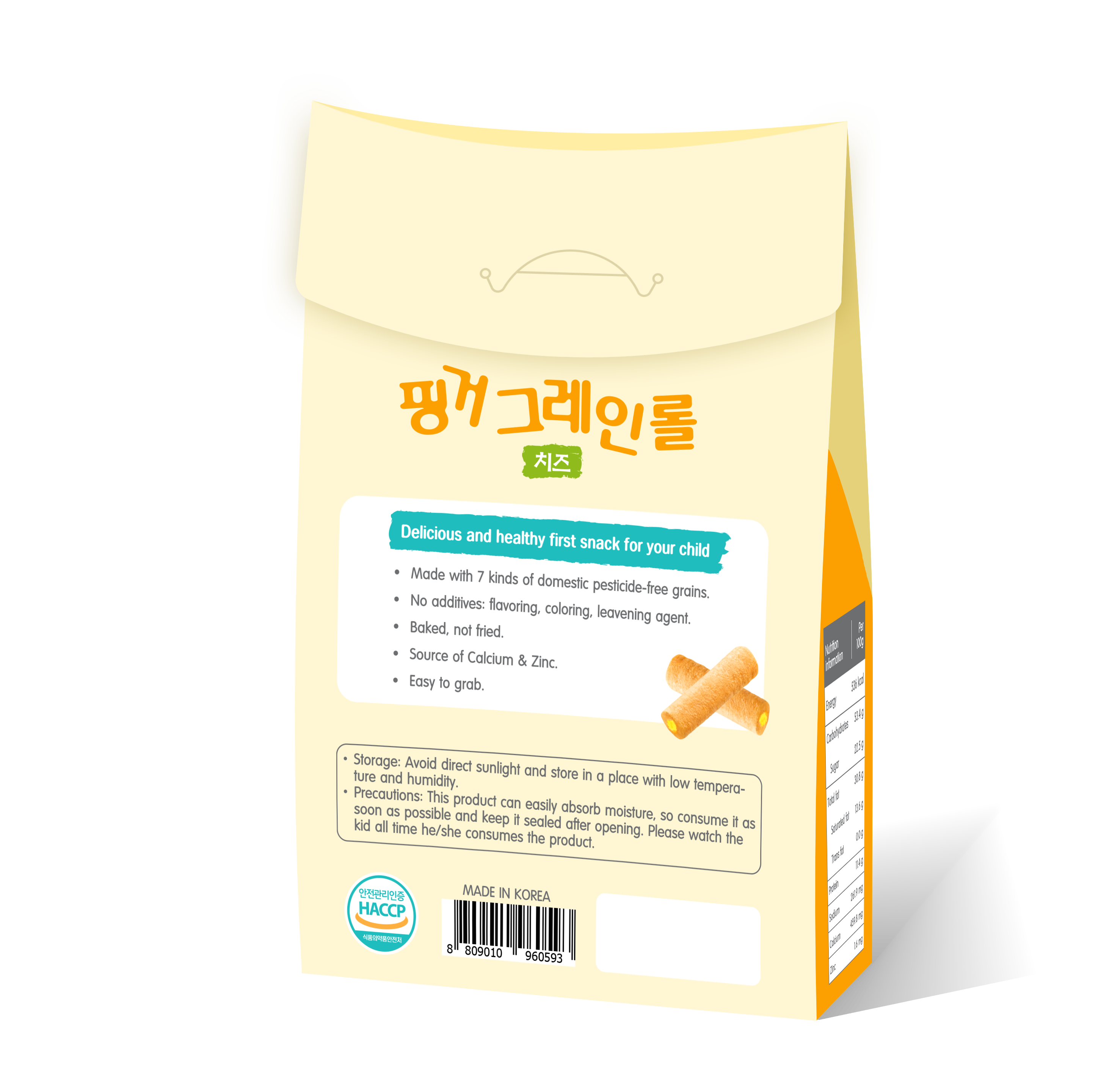 Thành phần: Hỗn hợp ngũ cốc 38,98% (gạo lứt Hàn Quốc / không thuốc bảo vệ thực vật 65,75%, gạo trắng không thuốc bảo vệ thực vật 16,95%, ngô 8%, lúa mạch nếp không thuốc bảo vệ thực vật 4,2%, gạo nếp không thuốc bảo vệ thực vật 4,2%, đậu đen không thuốc bảo vệ thực vật 0,3%, kê không thuốc bảo vệ thực vật 0,3%, gạo đen không thuốc bảo vệ thực vật 0,3%), dầu cọ (Malaysia), bột phô mai cheddar 4,78% (bột phô mai Đan Mạch, chất ổn định (Trinatri phosphat), bột sữa tách béo, đường glucose, đường kính, bột lòng đỏ trứng, chất làm rắn chắc (Calci carbonat) 0,6%, vitamin E 0,04%, muối biển (Hàn Quốc).